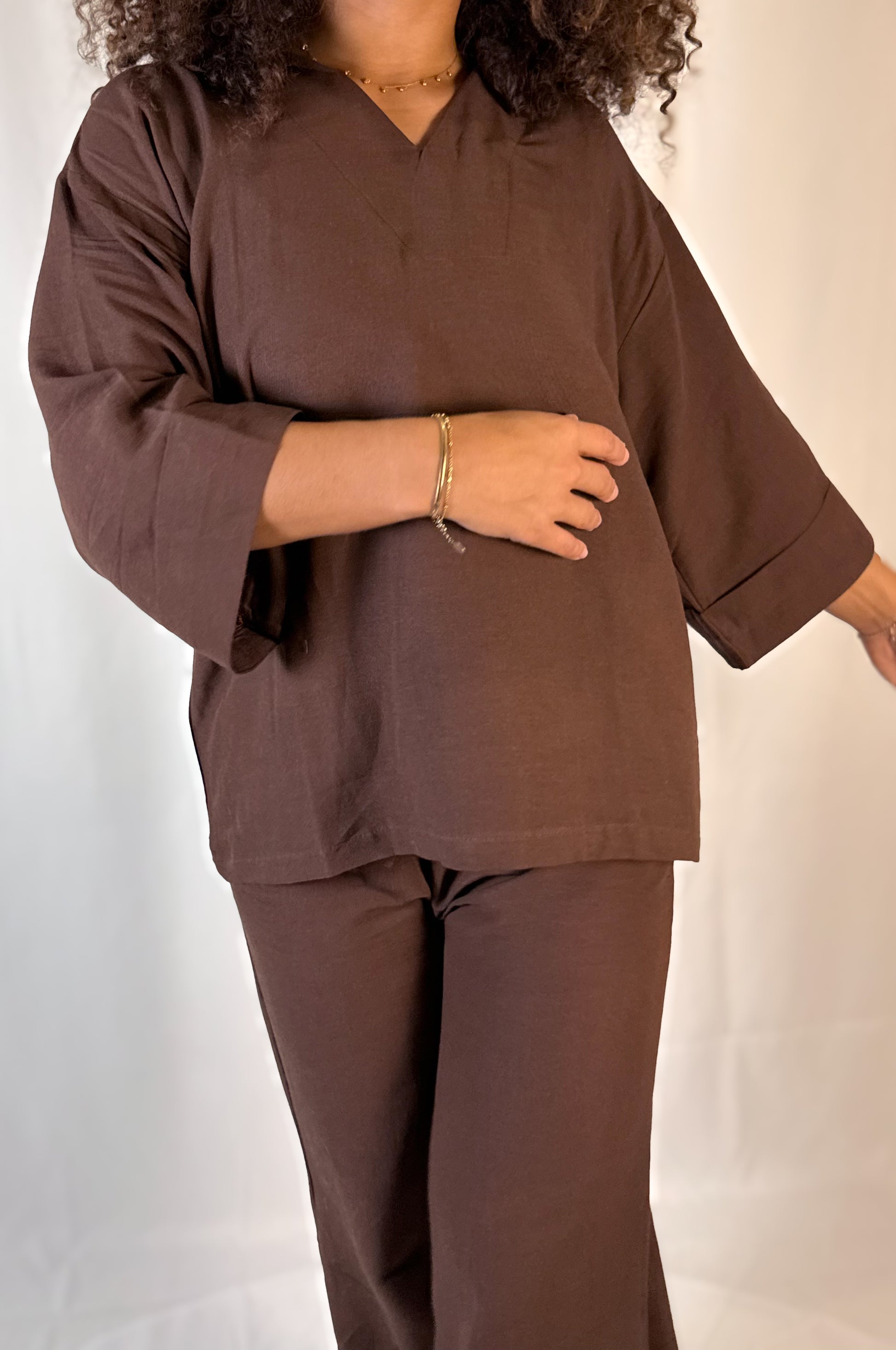 Élégant et confortable, cet ensemble marron associe fluidité et style. Confectionné dans un mélange de 40% coton, 40% viscose et 20% lin et fabriqué en Turquie, il offre une matière légère et agréable au toucher, parfaite pour un porté élégant au quotidien.